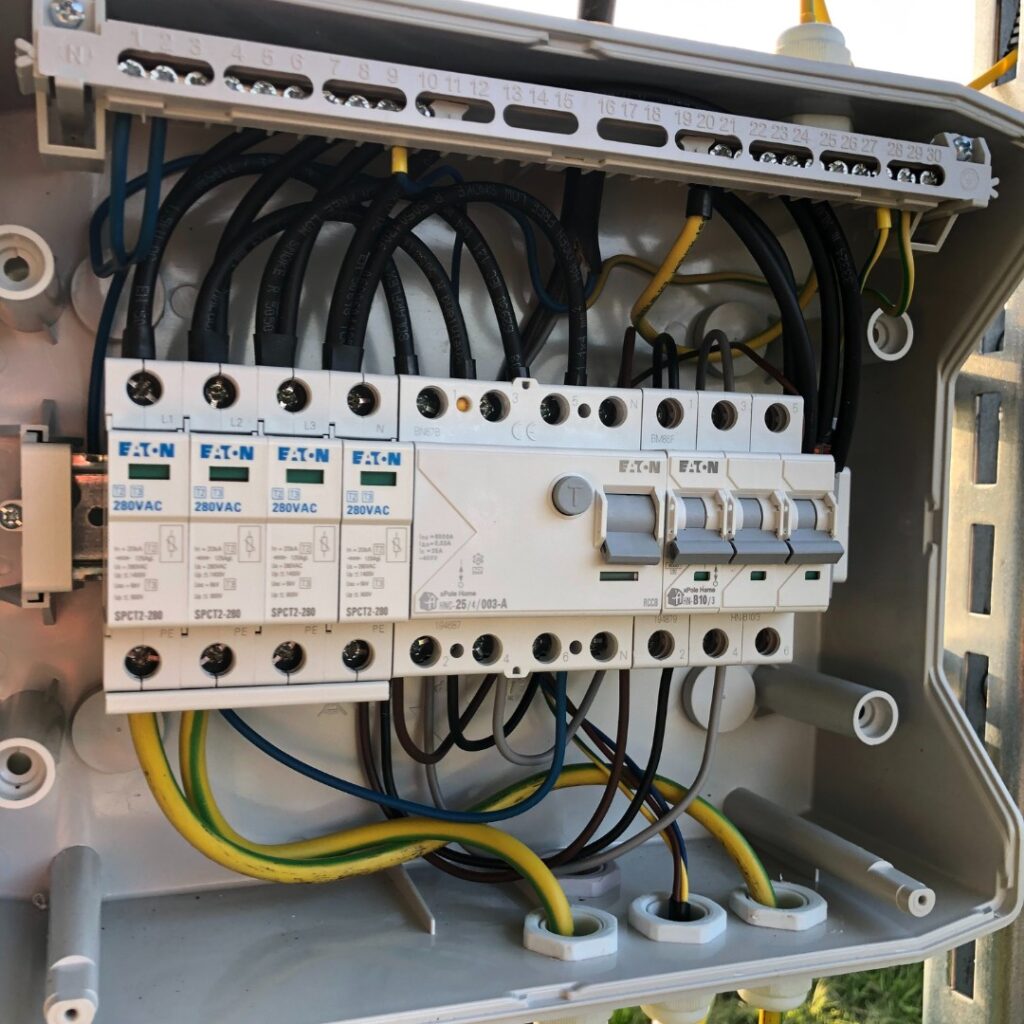 • instalację pełnego zestawu zabezpieczeń po stronie prądu stałego (DC) i zmiennego (AC), co zwiększa bezpieczeństwo użytkowania i trwałość całego systemu.